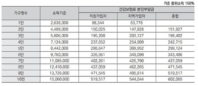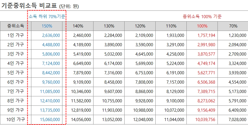 가구 규모에 따른 중위소득 150% (소득하위 70%)